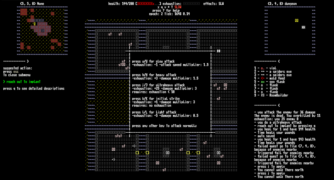 You control an @ in a top down view, walking through an ASCII world. You bump into enemies to attack them, but also can do special attacks that fills up your exhaustion bar.